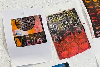 Photos from the gel plate workshop, a forthcoming exhibition, stash-buster knitting
